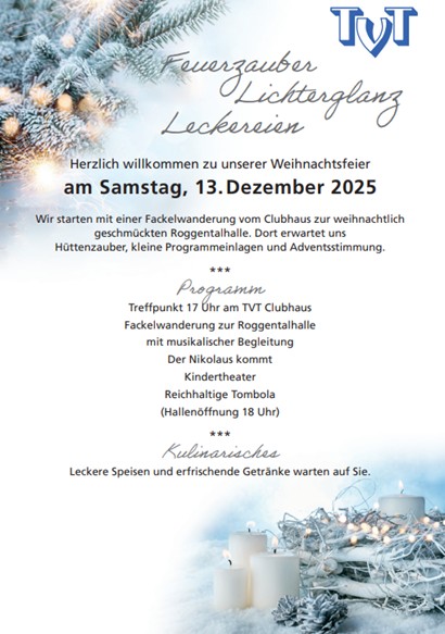 Die diesjährige Weihnachtsfeier des TVT findet am Samstag, den 13. Dezember 2025 statt. Beginn und Treffpunkt wird um 17 Uhr beim TVT-Clubhaus mit in einer Fackelwanderung zur Roggentalhalle sein. Dort wird eine weihnachtlich geschmückte Halle den Rahmen für die weitere Veranstaltung bieten. Der Nikolaus wird kommen mit Geschenken für alle Kinder. Dazu wird es ein Krippentheater „Weihnachten im Museum" vom Kinderturnen geben sowie weihnachtliche Stimmung und besinnliche Lieder. Der Kindergarten Treffelhausen wird auch mit dabei sein. Natürlich wird es auch verschiedene Essensangebote und Getränke an verschiedenen Ständen in der Roggentalhalle geben. Und es darf unsere reichhaltige Tombola sowie eine Sonderverlosung am Ende der Veranstaltung nicht fehlen. Wir würden uns über zahlreichen Besuch freuen.