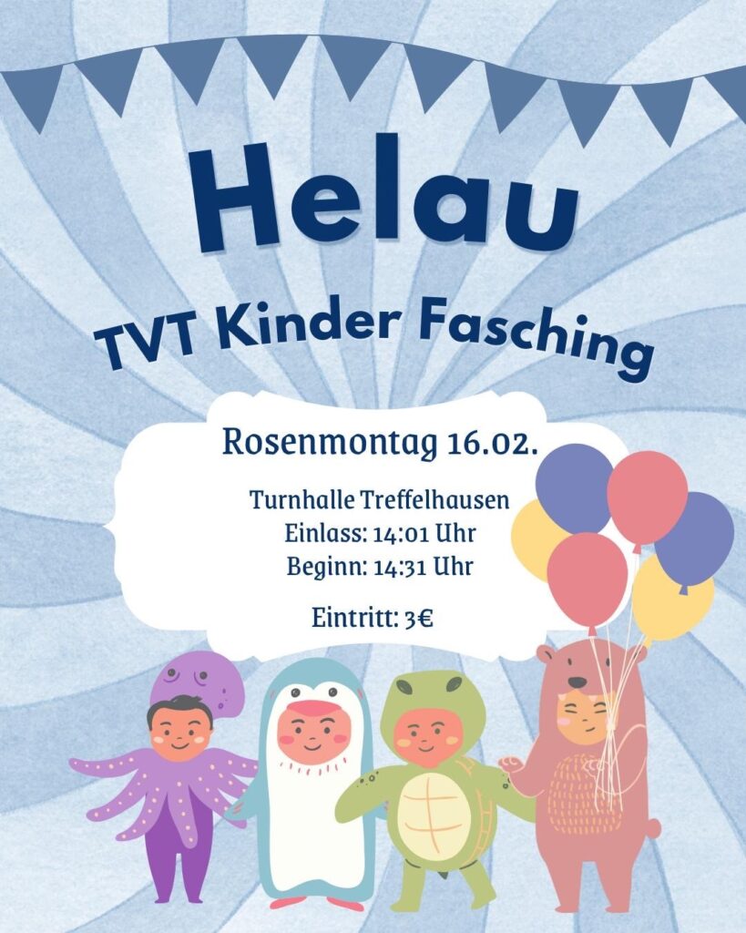 Am Rosenmontag den 16.Februar findet dieses Jahr wieder der traditionelle TVT-Kinderfasching in der Roggentalhalle. Es wird wieder ein buntes Programm mit Einlagen von verschiedenen Gruppen geben, dazu eine Bastelecke, gute Stimmung Faschingsmusik sowie leckeres zum Essen. Beginn wird um 14.01 Uhr sein. Es sind alle kleinen und großen Narren eingeladen – merkt Euch heute schon diesen Termin vor.